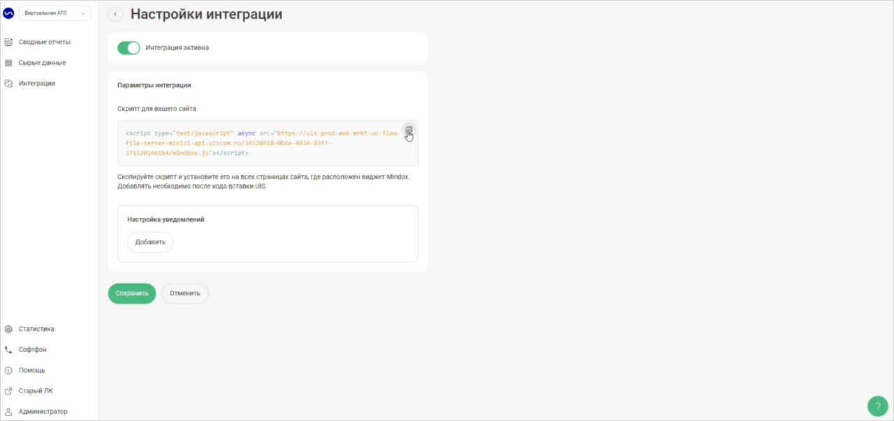 В Личном кабинете UIS откройте настройки интеграции и нажмите «Добавить» в поле «Настройка уведомлений»: