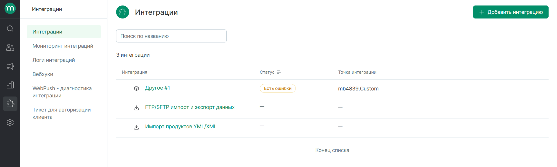 В новом Личном кабинете UIS откройте раздел «Интеграции» и найдите в списке Mindbox. Подключите интеграцию, включите настройку «Интеграция активна» и нажмите «Сохранить»: