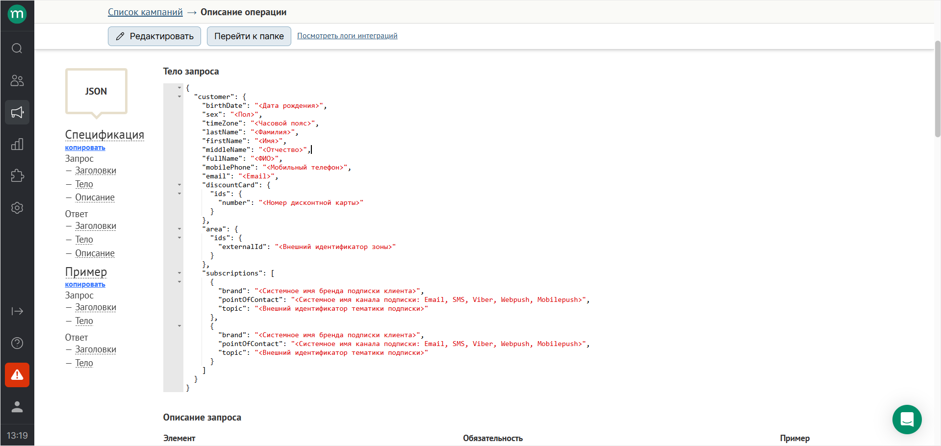 В поле «Тело» нужно вставить JSON-запрос из настроек операции в Mindbox. Вместо значений после «:» добавьте нашу мнемонику: