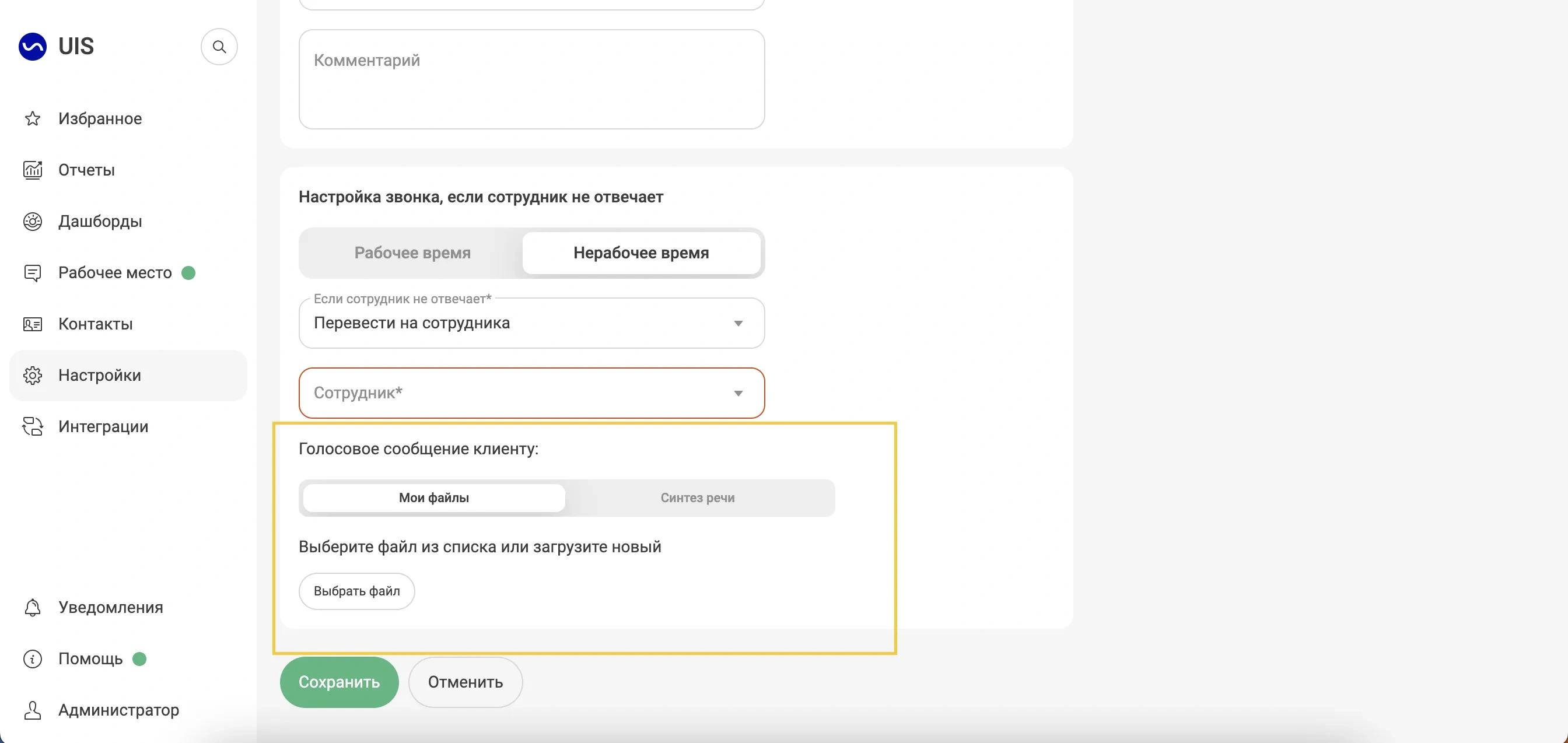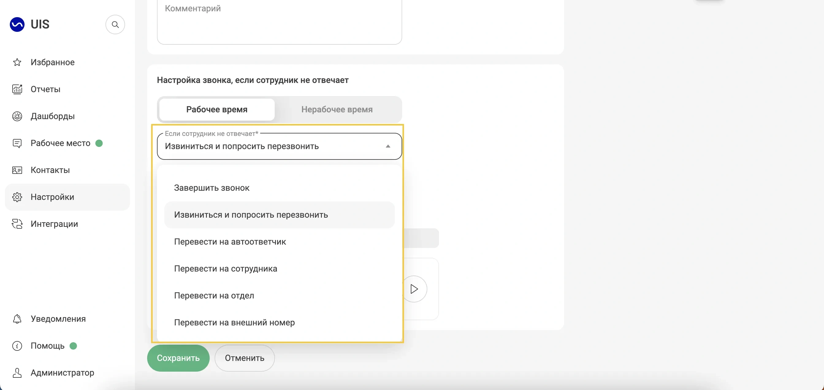 Таким образом вы можете настроить разные сценарии спасения звонка для рабочего и нерабочего времени. К примеру, если сотрудник не ответил в рабочее время, звонок направляется его коллеге, а в нерабочее — идет на дежурного сотрудника, или включается автоматическое информирование о графике работы компании.