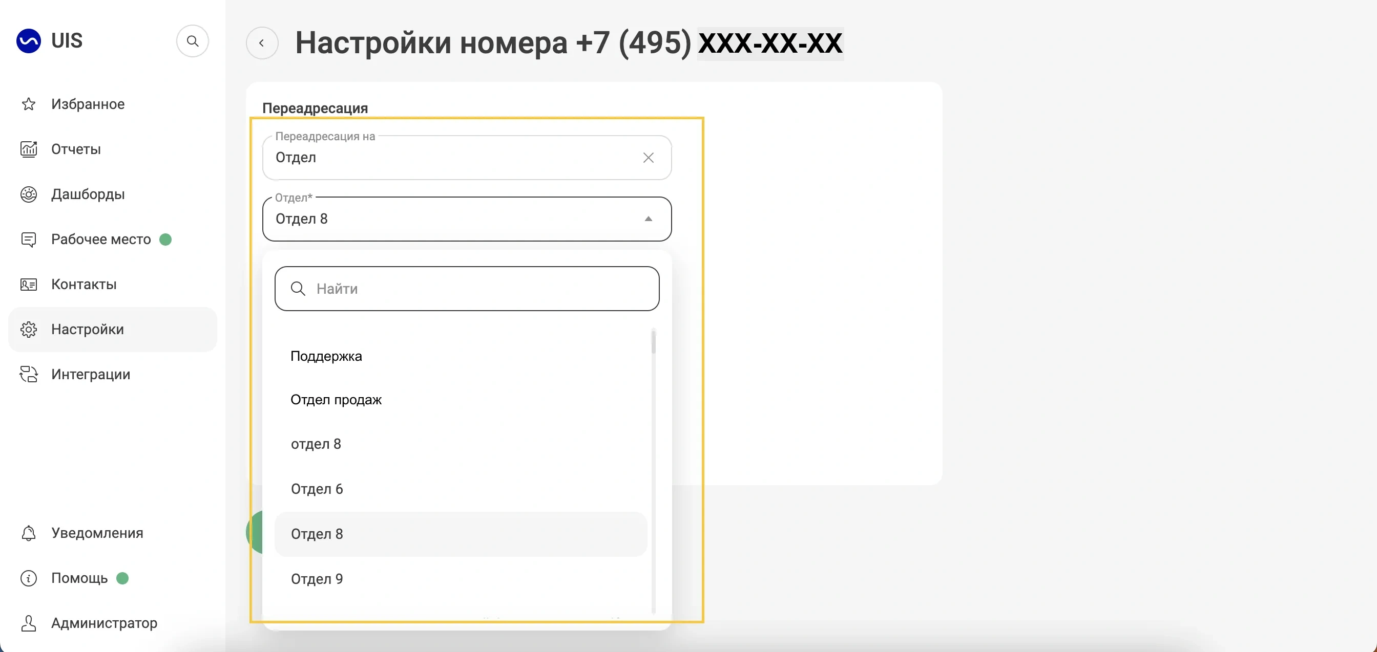 В зависимости от выбранной сущности откроется поле для более конкретного указания, на кого перевести звонок, а также окошко для комментария (он отобразится в общей таблице номеров):