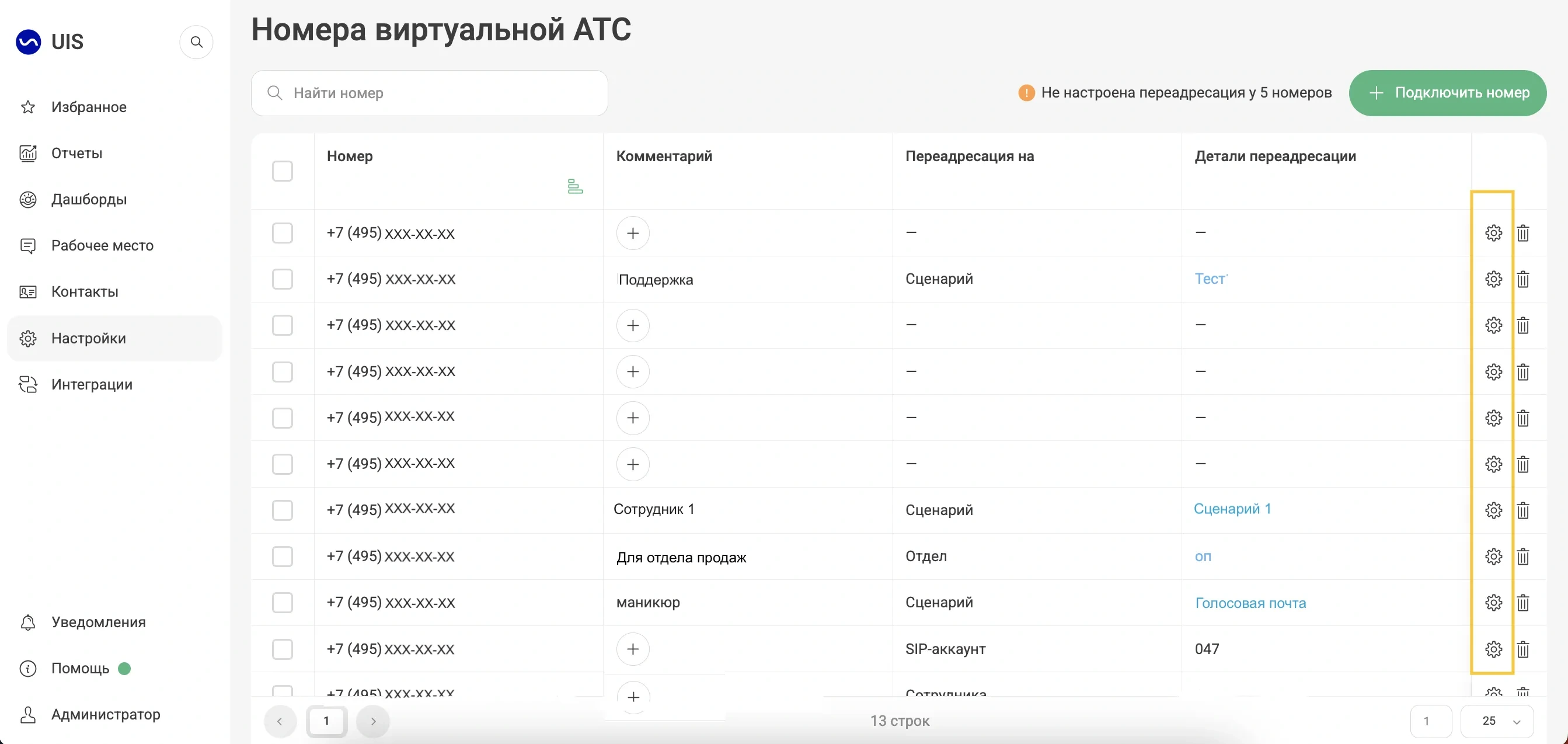Страница настройки номера открывается при нажатии на шестеренку напротив соответствующего номера в общей таблице: