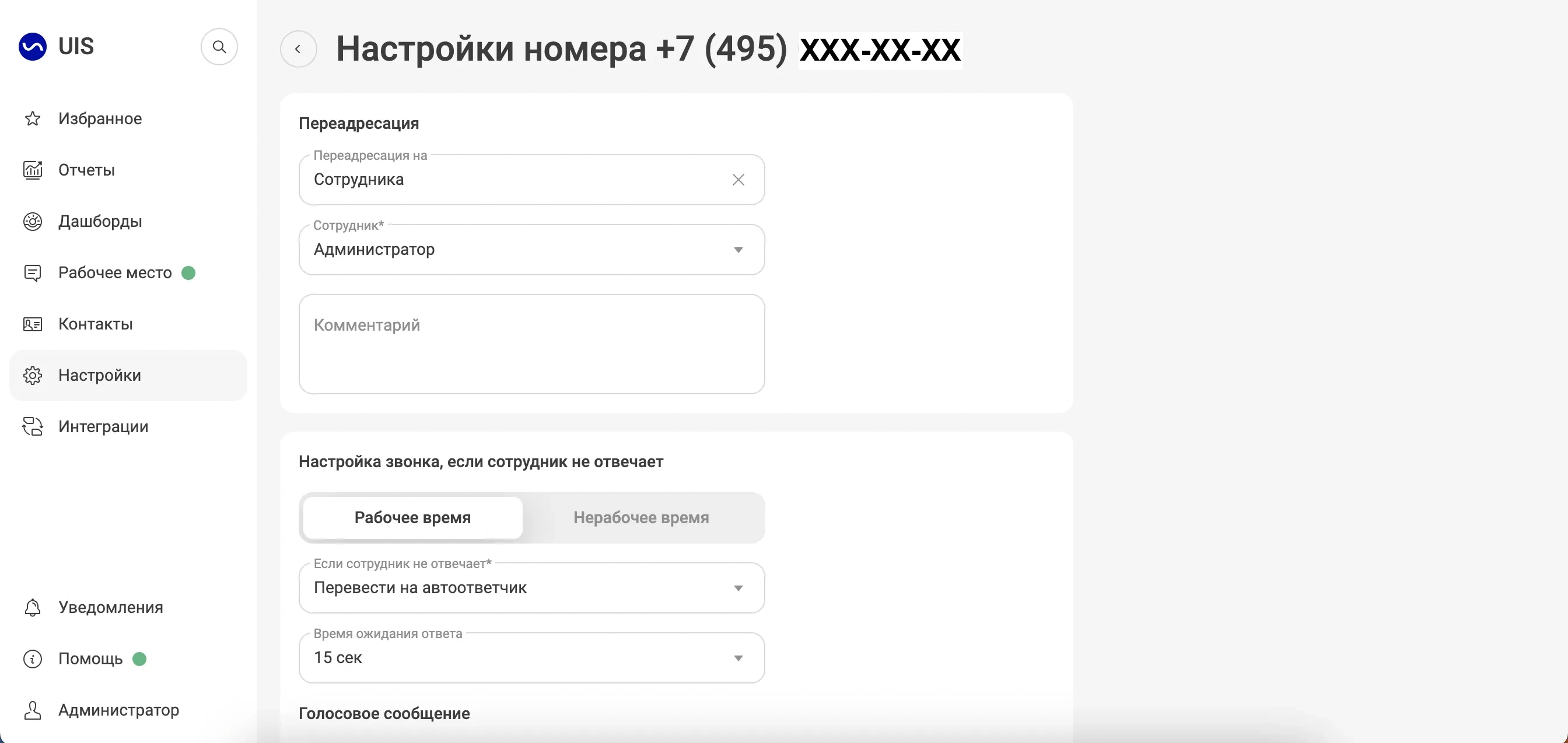 - переадресация на: информация о способе обработки звонка, заданном при настройке номера;